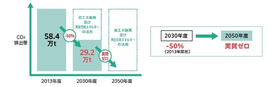 東京メトログループ全ての事業における先端技術の採用や改善活動等の創意工夫により、再エネの活用や更なる事業の省エネ化を通じ、東京メトログループ全事業のCO2排出量について「2030年度50%削減(2013年度比)、2050年度実質ゼロ」を目指します。