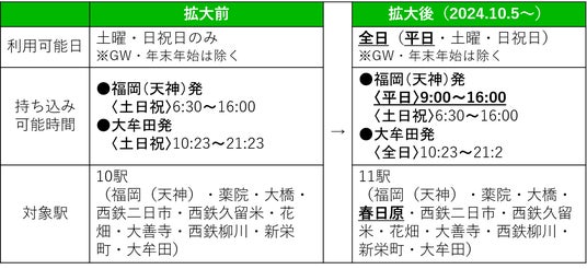 1.平日も利用可能になります(10月7日より)2.春日原駅を対象駅に加えます(10月5日より)