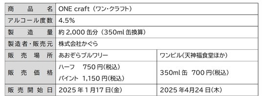 「ONE craft」はワンビル開業を記念して開発・醸造するもので、博多区の「あおぞらブルワリー」との共創、そして、ワンビルに入居予定の企業で働く「天神ワーカー」のみなさまとの共創、2つの共創により実現するものです。