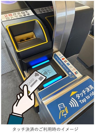 本サービスは、三井住友カード株式会社が提供する公共交通機関向けソリューション「stera transit(ステラ トランジット)」を活用するもので、お客様がお持ちのタッチ決済対応のカード(クレジット・デビット・プリペイド)や、同カードが設定されたスマートフォン等を改札機の専用リーダー(ディスプレイ部分)にタッチすることで、改札を通過できます。