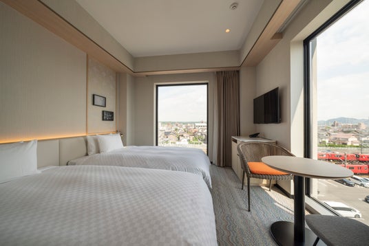 2面の大きな窓が開放的なワンランク上のツインルームです。浴槽付きのバスルームで広々とご利用いただけます。(23.8平方メートル )