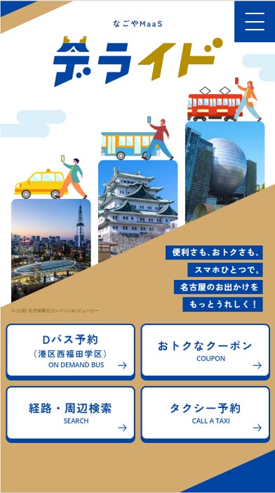 名古屋鉄道は本実証実験の開始にあたり、名古屋市に特化したマイクロMaaSアプリ(WEB版)「デライド」のサービス提供を開始します。これは同社が提供するエリア版MaaSアプリ「CentX(セントエックス)」の機能を活用し、地域住民や来訪者に対する交通手段に加え、観光地や商業施設等の情報を提供し、スムーズな移動および周遊の促進により地域活性化を図るものです。