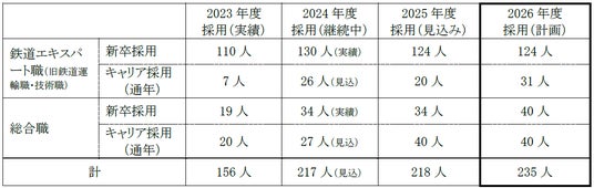 ・2026年度入社の採用数について、鉄道エキスパート職・総合職合わせて、235人を計画します。