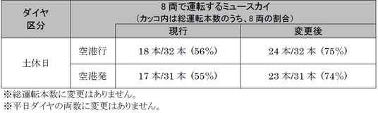 中部国際空港をご利用のお客さまや、愛知県国際展示場へお出掛けのお客さま等のご利用が多い土休日ダイヤの一部ミュースカイについて、4両から8両に増結して運転し、中部国際空港アクセスの利便性を向上します。