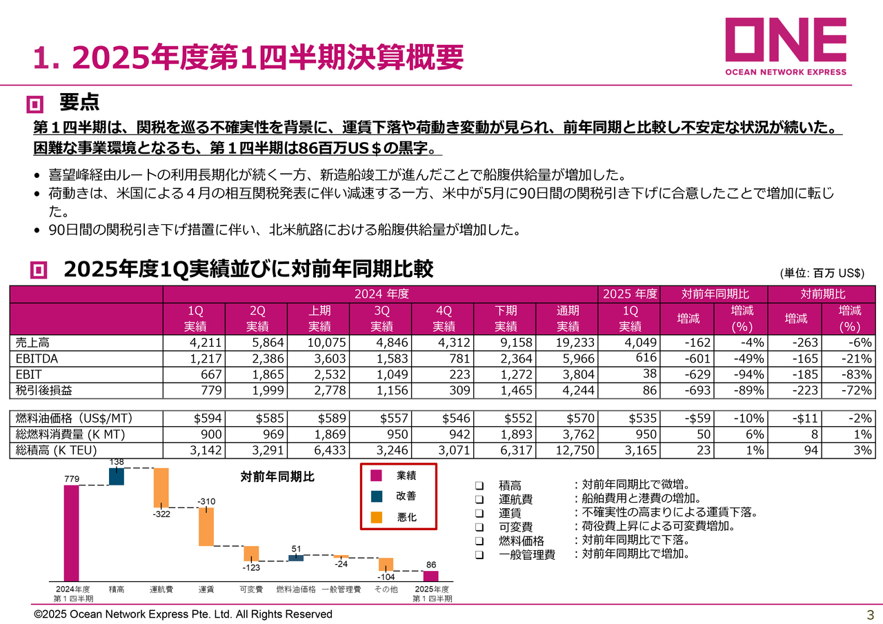 コンテナ船事業については、関税発動前の駆け込み需要を含めてONE社の輸送量は前年同期比で微増でしたが、運賃の下落により利益が減少し、前年同期比で大幅な減益となりました。