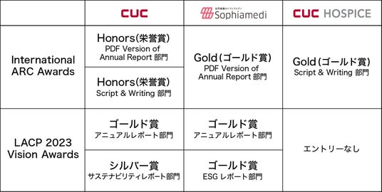 国内外の医療機関の経営支援やホスピス、居宅訪問看護などの事業を展開するCUCグループは、主要3社(株式会社シーユーシー 代表取締役:濱口慶太、以下「CUC」/株式会社シーユーシー・ホスピス 代表取締役社長:田邉 隆通、以下「CUCホスピス」/ソフィアメディ株式会社 代表取締役社長:伊藤綾、以下「ソフィアメディ」 )が発行した、2023年度発行の年次報告書が世界最大級のアニュアルレポートコンペティション「International ARC Awards」及び「LACP 2023 Vision Awards」にて受賞したことをお知らせいたします。