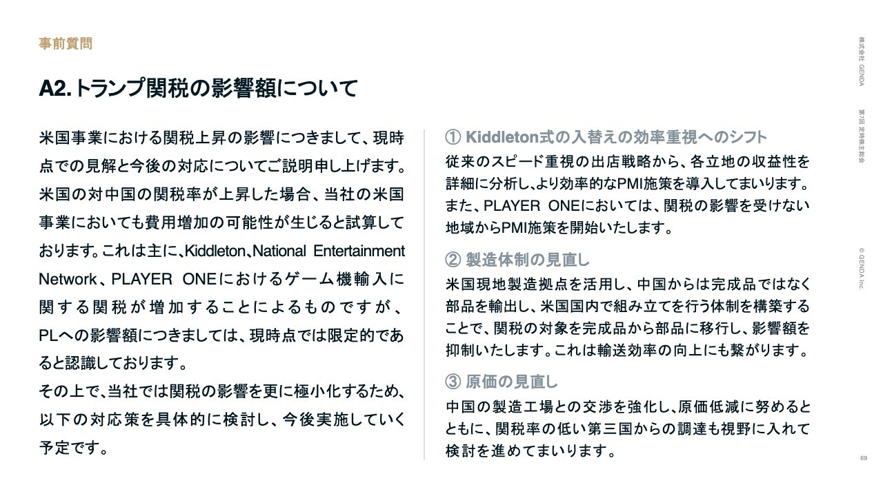 質問者:トランプ関税が、御社のPLAYER ONE、National Entertainment Network、Kiddletonに与えるマイナス影響のうち、具体的に関わる部分は景品部分とミニゲーム機などだと思います。それらは100パーセントが中国製のものでしょうか?