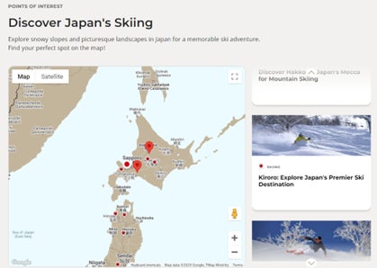 「Japan Airlines Vacations」では、スキー商品だけでもニセコや富良野などの人気エリア含む12エリアのコンテンツをご紹介しており、行きたいエリアを地図から選択することもできます。さらに「Japan Airlines Vacations」でご予約のお客さまは、スポーツ用品受託手荷物無料キャンペーンのご利用で、よりお得に便利に日本でのスキーを楽しんでいただけます。