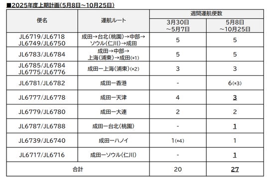 ・成田ー天津の往復路線を週3便に、成田ー台北の往復路線を週1便に変更します。