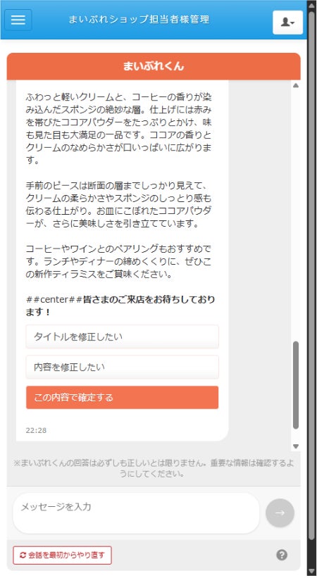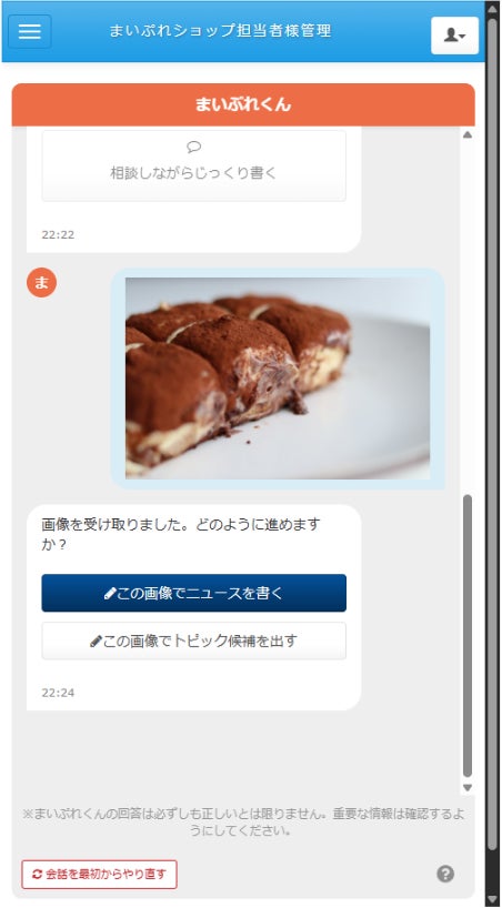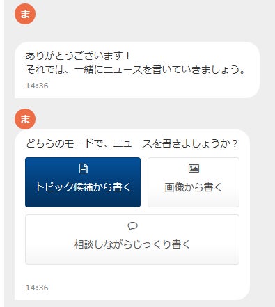 ニュース作成時に、まいぷれくんがいくつかのニューステーマを提示。その後のまいぷれくんからの問いかけや、内容修正に関しても選択肢が出てきます。