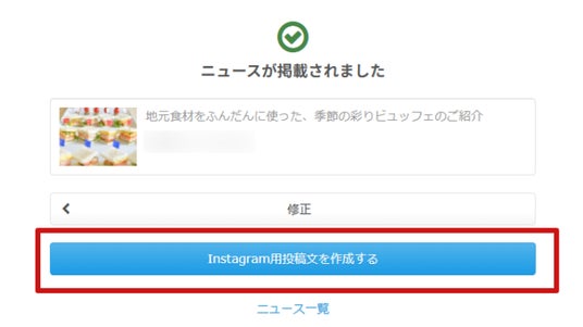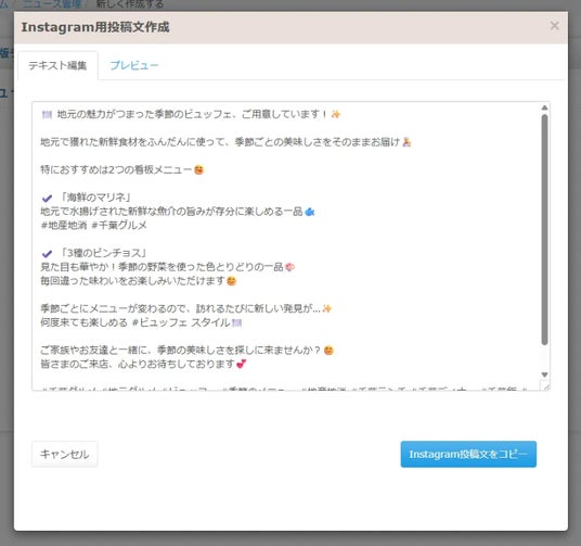 作成したニュース文章をもとに、Instagram投稿用のキャプションとハッシュタグを自動生成。コピー&ペーストでそのままInstagramへ投稿できるため、SNS連携もスムーズに。これにより、オンラインでの情報拡散力も向上します。