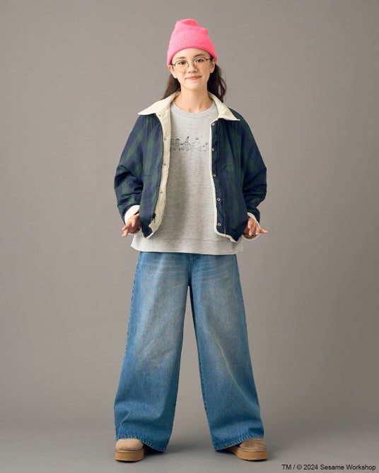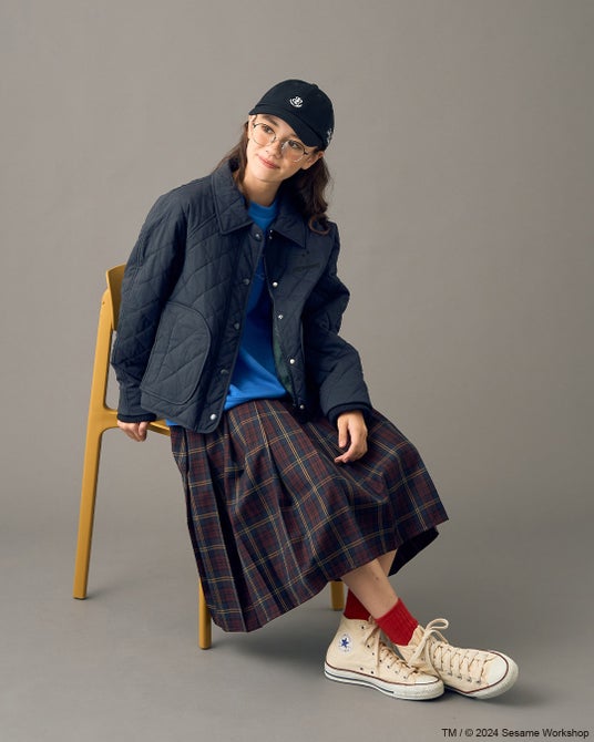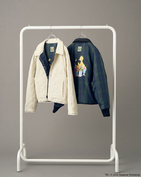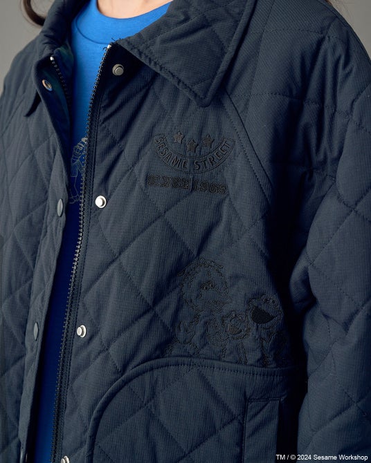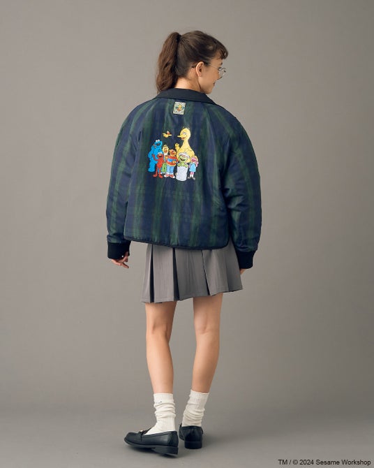 ライトな羽織り心地が魅力の中綿入りブルゾン。光沢を抑えてマットに仕上げた素材がカジュアルシックな雰囲気を演出。胸元のセサミストリートの刺繍とポケットから飛び出したようなキャラクターがポイントです。極薄の中綿を封入しているため、分厚過ぎずロングシーズン着回せるアイテムになっています。チェックの裏地にもキャラクターのプリント入りで、リバーシブルでご着用いただけます。