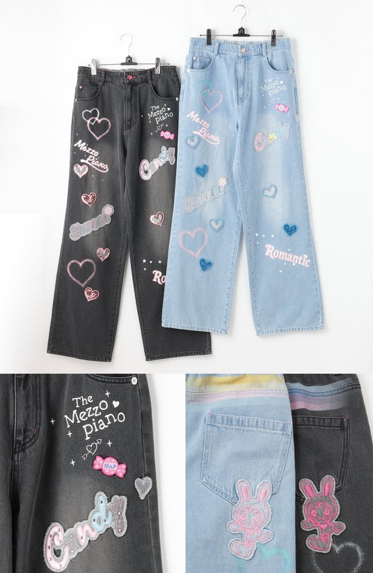 スプレープリントやラメプリント、スパンコールワッペン、ハートアップリケ、ベリエちゃんアップリケが盛り込まれた、特別感あふれるデコラティブなワイドデニムパンツ。主役級のY2Kスタイリングを楽しめます。
