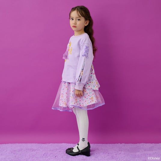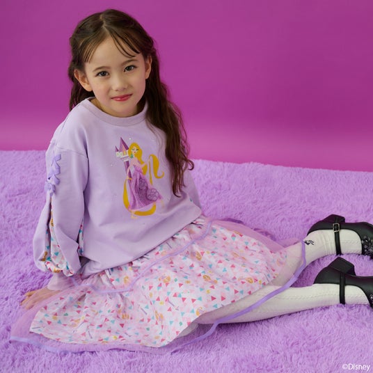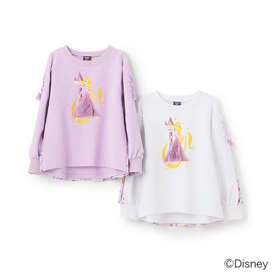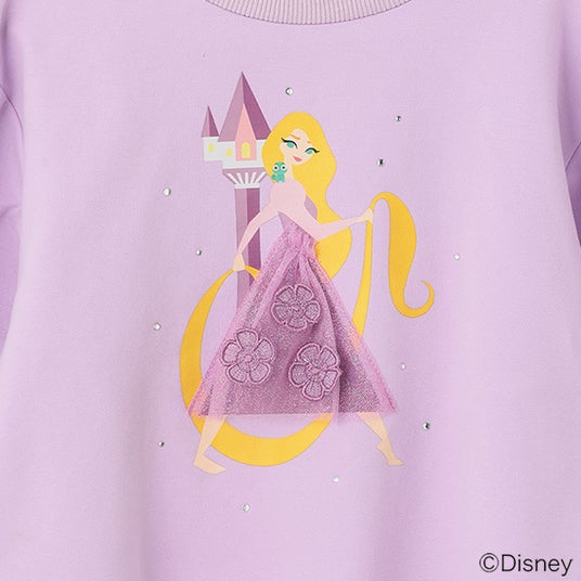 ディズニープリンセス『塔の上のラプンツェル』のデザインをほどこしたトレーナーは、フロントにデフォルメされたラプンツェルのアートを配置し、ドレスはチュールと花モチーフを重ねて立体的に表現し、袖のレースアップはラプンツェルのドレスをイメージしてデザイン♪