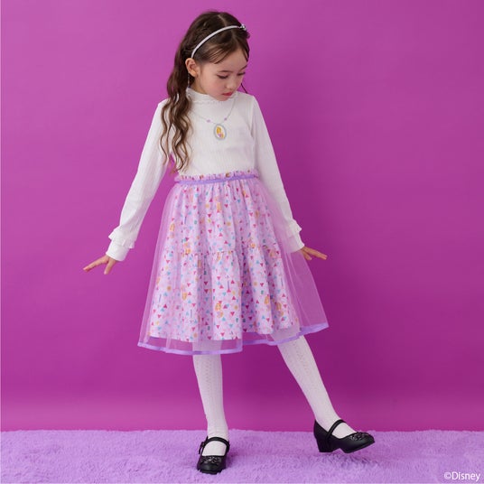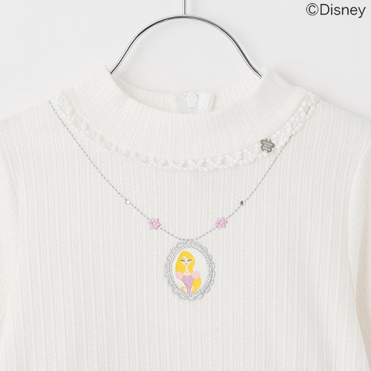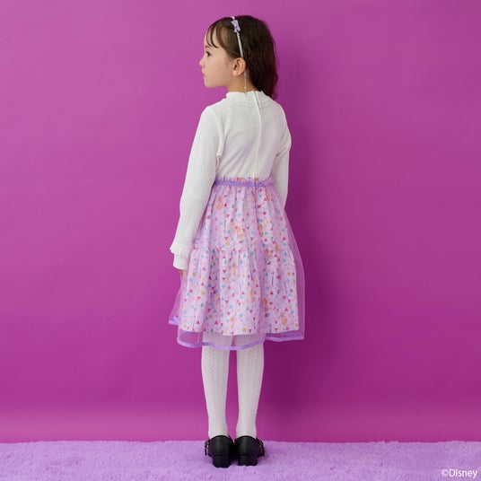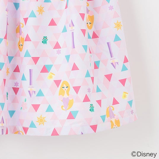 首元はネックレス風の刺しゅうを飾り、華やかさをプラス。スカート部分にはデフォルメされたパスカルやラプンツェルが住む塔、太陽の紋章などをモチーフにした、アート感のある総柄プリントを使用しました。 憧れのプリンセス気分をお楽しみください♪