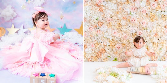 ナルミヤブランドのオリジナルドレスや洋服などを着て、お子さまのバースデー記念写真や家族写真の撮影ご利用券をお届けします。