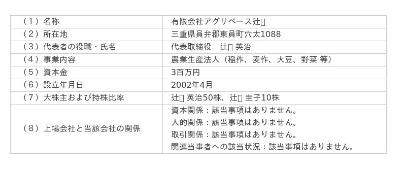 当社は、2025年6月6日開催の経営会議において、以下のとおり、有限会社アグリベース辻(以下「アグリベース辻」という)の株式の一部取得について決議し、同日付けで株式譲渡契約書を締結いたしましたのでお知らせいたします。