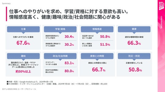 ユーザーは放送局のメディアらしく幅広い世代・性別が閲覧しています。その中でも世帯年収が高く、役職者が多い特徴があります。彼らは仕事へのやりがいを求め、学習/資格に対する意欲を持ちます。さらに情報感度が高く、健康/趣味/政治/社会問題への関心も高い傾向があります。ご自身が担当される事業/サービスにマッチするユーザー層が見つかるかもしれません。