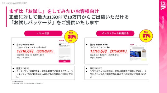 この度、期間限定で特定の業界様向けにバナー広告・インストリーム動画広告を小口10万円からご出稿いただける「お試しパッケージ」をご用意しました。さらに半年・年間契約いただくと正価より最大25%OFFとなる「アップフロントパッケージ」も用意しております。(※適用には諸条件あり)
