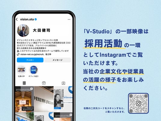 「V-Studio」は、当社代表取締役社長の大田がMCをつとめ、ビジョングループで働く従業員が主役となる対談形式のトーク番組です。2024年3月の配信開始以来、毎週水曜日の12時に放映し、従業員が新しいことに果敢に挑戦できる環境を大切にしながら、番組を通じて部門間のシナジーを高め、社内のエンゲージメント向上を図っています。