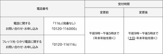 東日本電信電話株式会社(以下、NTT東日本)は、電話に関する移転や各種サービスなどのお問い合わせ・お申し込みを承る「116(局番なし)」「0120-116000」および、フレッツ光などのサービスに関するお問い合せ・お申し込みを承る「0120-116116」の受付窓口の営業日について、2025年2月1日(土)より下記のとおり変更いたします。