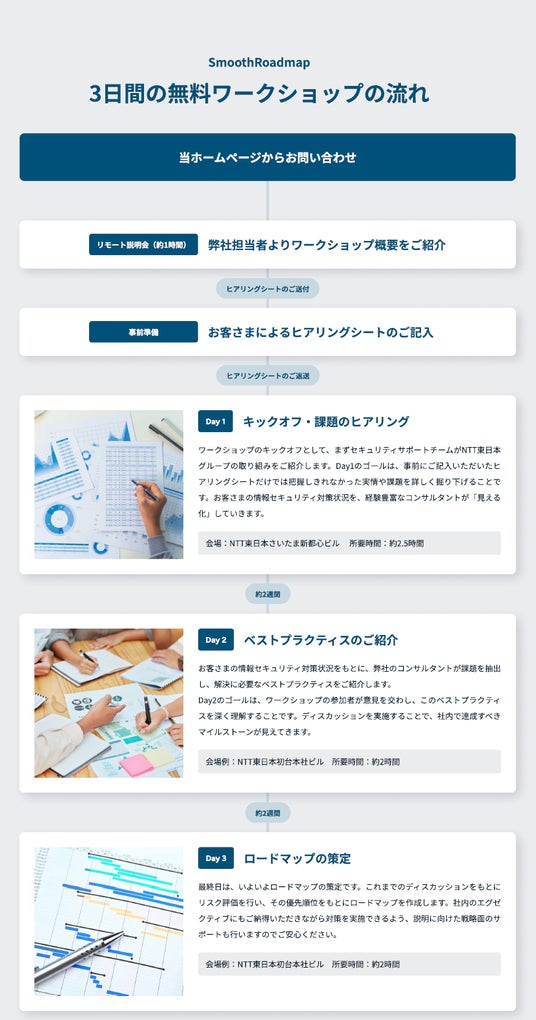 東日本電信電話株式会社(代表取締役社長 澁谷 直樹、以下「NTT東日本」)は、地域の企業の皆さまを対象に1社ごと開催する3日間の無料ワークショップ「SmoothRoadmap」(以下「本ワークショップ」)を2025年5月29日より提供開始いたします。本ワークショップは、NTT東日本の情報セキュリティ対策のノウハウをもとに、お客さまのセキュリティ環境を可視化し、お客さまの課題に合わせたベストプラクティスを紹介するワークショップとして、セキュリティコンサルタントがお困りごとを見える化しながら安心できる業務環境を構築するまでのロードマップを一緒に描きます。