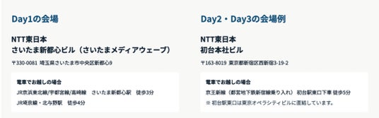 ワークショップはお客さま1社ごとに開催いたします。Day1ではNTT東日本さいたま新都心ビル(さいたまメディアウェーブ)。Day2・Day.3ではNTT東日本初台ビルで実施いたします。