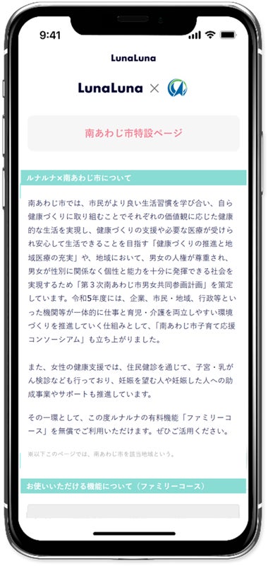 本連携協定により、南あわじ市の住民に対し、すべての女性の一生に寄り添うウィメンズヘルスケアサービス『ルナルナ』の有料機能である「ファミリーコース」の無償提供を開始します。『ルナルナ』のサービスを通じて、不妊治療や妊活に関する基礎知識などの情報配信も予定しており、利用者はライフステージに合わせた健康情報を受け取ることができます。