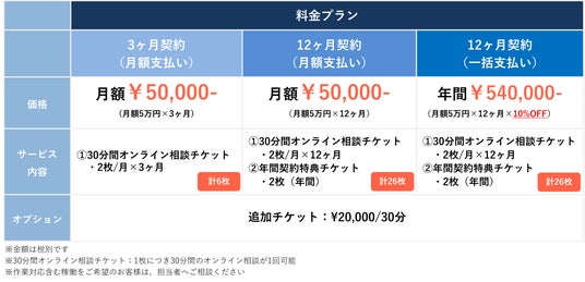 3ヶ月契約からご利用いただけます。料金は月額5万円(税別)で、30分間のオンライン相談ができるチケットが毎月2枚付与されます。チケットは獲得した翌月末まで有効です。1枚2万円(税別)で30分間のオンライン相談チケットの追加も可能です。オンライン相談だけでなく、マーケティングに関わる作業依頼を希望される場合は別途ご相談をお受けすることも可能です。