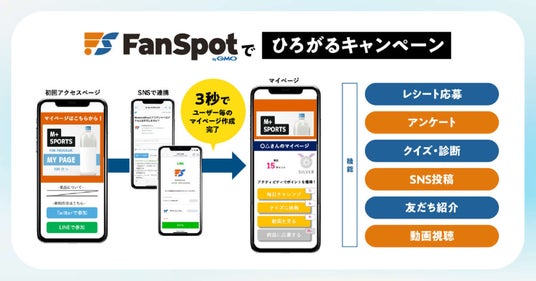 「FanSpot byGMO」は広告主企業がSNSや動画プラットフォーム上で実施するレシート応募、クイズ、SNS投稿型キャンペーンにおいて、参加者がTikTok、LINE、X(旧Twitter)、Instagramなどのプラットフォームからワンクリックで連携することで、参加者専用のマイページが作成されるツールです。