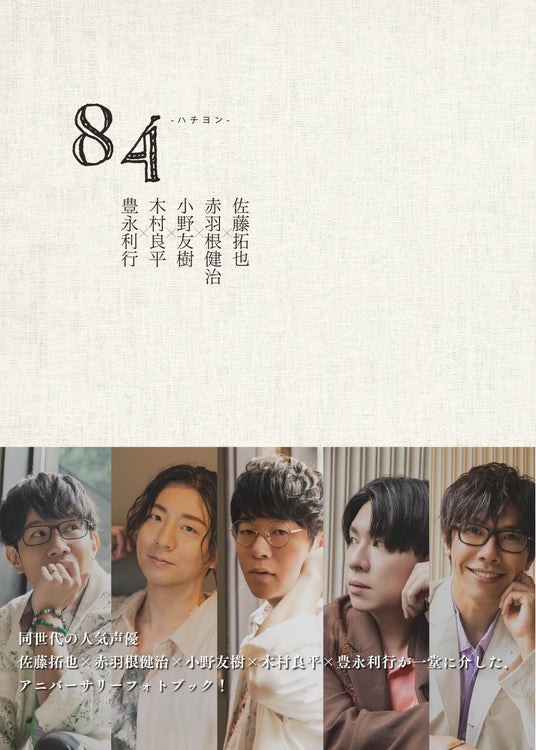 佐藤拓也が発起人となり、赤羽根健治×小野友樹×木村良平×豊永利行の同年代の男性声優が一堂に介した記念フォトブック、「84 -ハチヨン- 佐藤拓也×赤羽根健治×小野友樹×木村良平×豊永利行」が、本日2024年10月28日(月)に発売!