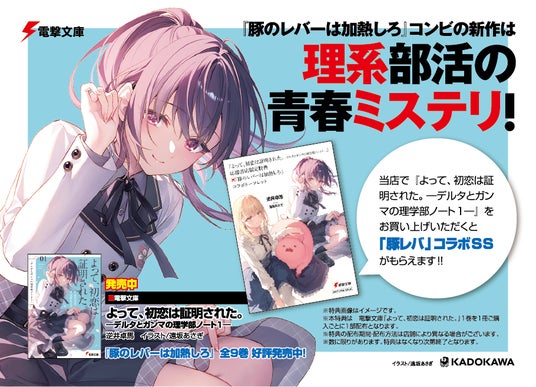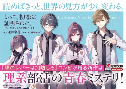 株式会社KADOKAWA(本社:東京都千代田区、取締役 代表執行役社長 CEO:夏野 剛、以下 KADOKAWA)は、電撃文庫より『よって、初恋は証明された。 -デルタとガンマの理学部ノート1- 1』を2024年11月8日(金)に発売いたします。本作は、TVアニメ化した『豚のレバーは加熱しろ』(豚レバ)の著者・逆井卓馬と、イラストレーター・遠坂あさぎによる新作小説です。科学を愛する高校生たちの、ほろ苦くも瑞々しい、青春ミステリが描かれる。