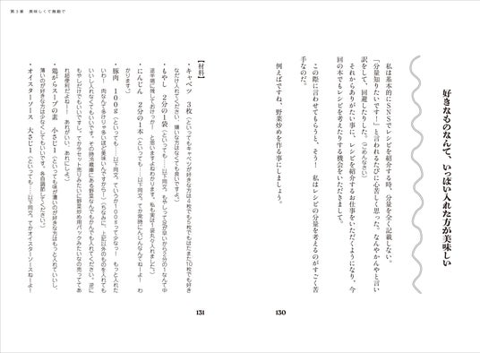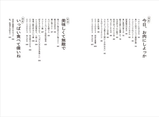 第1章では、SNSでは話さない自身のこと。第2章は、大切な日々の記憶。第3章では、気取りすぎず、オシャレすぎず、こだわりもある料理に対する気持ち。第4章は、読者のみなさんに伝えたいメッセージを綴っています。