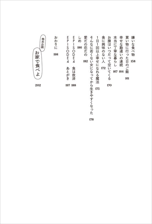 ――人間だから傷つき傷つけられ悩む事からは逃れられない。そんな時に、美味しい物を食べて「美味しい」と思える人は強い。幸せをちゃんと幸せだと認識できている証拠だから。自分をしっかり節制して、スタイル良くいる人もカッコいいけれど、「今日はダイエットやめやめ!」って好きな物をたんまり食べて自分をしっかり甘やかせる人も、またカッコいい。(本文より抜粋)