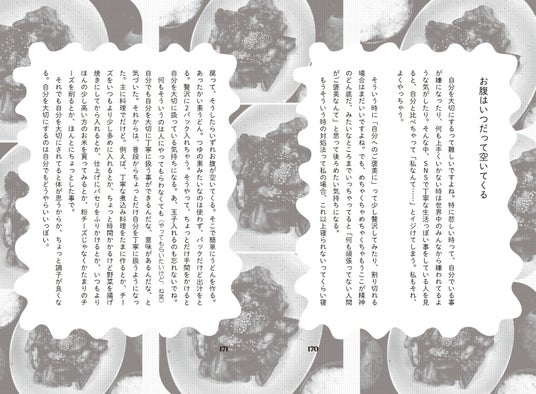 ――「食べ物はひたすら幸せであってほしい」が私の願い。でも、世の中厳しすぎ。食べるのが怖くなったり、食べても罪悪感を感じたり、悲しいよ。悲しすぎる。でも若い頃って、それも必要なのかな。私はずっと誰かに「大丈夫、食べてもいいじゃん。可愛いよ」そう言ってほしかった。今、歳をとり、思った。私がみんなに言ってあげたい。どこの誰かもお互いわからないけど、無責任にそう言ってあげたい。たまにはそういう人がいてもいいじゃんね。私が何度でも何度でも言うね。「いっぱい食べて偉いね」みんなが悩んだ時に、美味しいお菓子でも食べながら見てほしい、私からのメッセージ。(本文より抜粋)