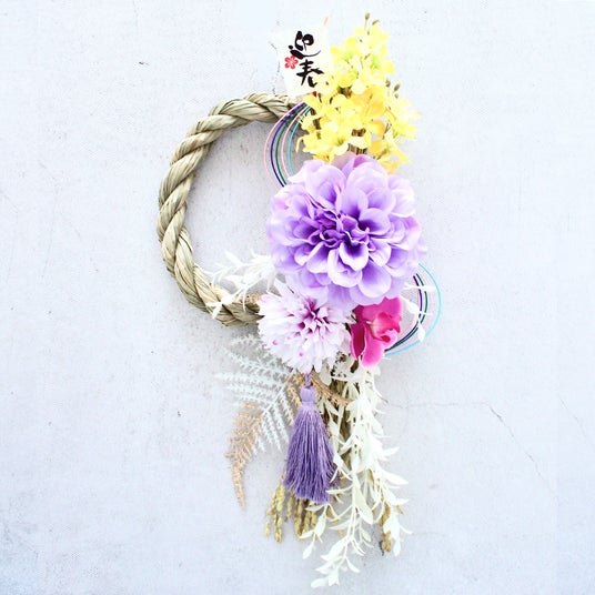 上質なアーティフィシャルフラワーで仕立てるお飾りは、ダリアやランといった華やかな花々をメインに縁起花材も添え、洗練されたデザインです。