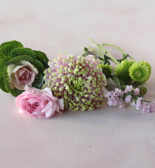 かわいらしさにもこだわりました。大輪のキクや小さなハボタンはピンク系の花を選択。縁起のよい花たちに寄り添わせるのは、春らしいピンクのラナンキュラスです。日に日に丸く、大きく咲いていく様子に幸せを感じてください。