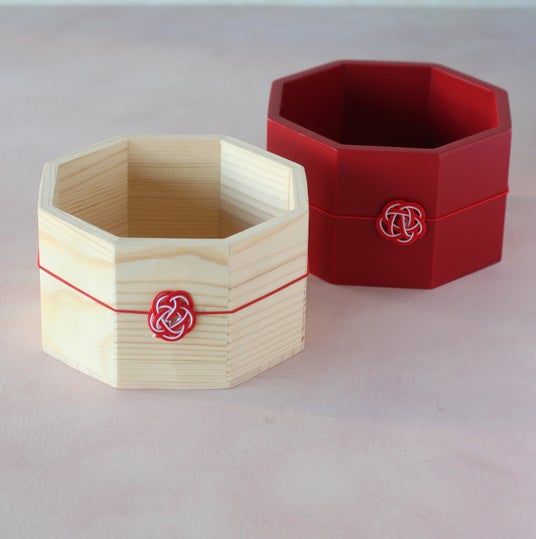 器には、梅結びにした紅白の水引をあしらいます。梅結びは、解けにくいことから、固い絆を表す結び方です。さらに、梅は古くから厄除けの木。梅結びには、無病息災の願いが込められています。