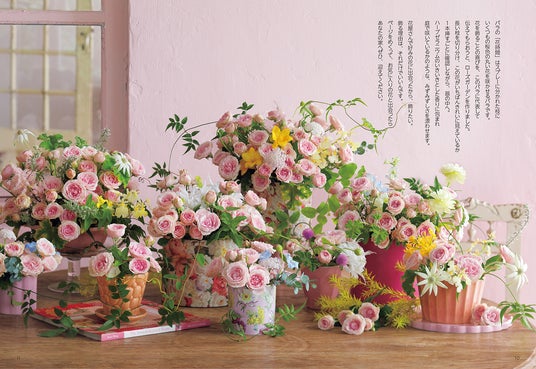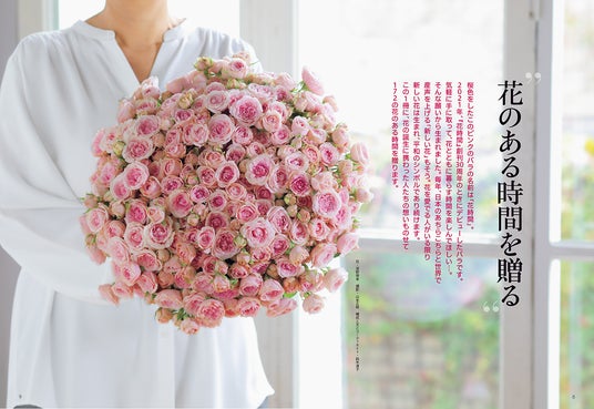 バラ「花時間」は、創刊30周年を記念して誕生した花。大輪の華やかな花ではなく、あえて、やさしげなスプレータイプの花にすることで、気軽に手に取って、花を飾り、花とともに暮らす時間を楽しんでほしい……そんな願いから生まれたバラです。巻頭では、この花をふんだんに使い、春のガーデンのような飾り方を提案します。