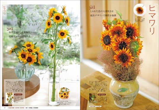 7大花に続いて紹介するのは、アスターから始まる、おなじみの花たちの新しい花。五十音順に並べることで、図鑑としても活用できる利便性をもたせました。背丈ほどもあるロングサイズの切り花ヒマワリや、手のひらサイズのポピーなど、驚きがいっぱいです!