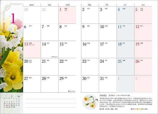 毎日の予定を書き込める、マンスリータイプのスケジュール帳です。月ごとに季節の花が載っているほか、巻末には花の出回りカレンダーも収録。花屋さんへ出かける際に役立ててください。