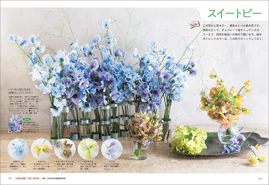 掲載品種は172。季節が巡るたび、目にするおなじみの花も色や姿でサプライズを楽しませてくれます。紹介する172品種のうち花別アレンジでの紹介は、128。アレンジの数々は、眺めるだけでじつに圧巻。実際に飾ってみたいと思う人のために、アレンジのコツと出回り時期の目安をつけました。過去号にも類書にもない、花好きには保存版の1冊です。