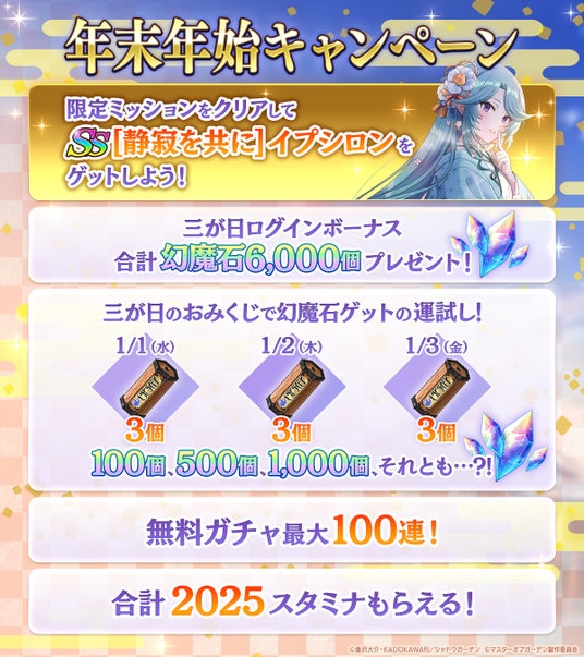 さらに、2025年1月1日(水)・2日(木)・3日(金)にログインするだけで最大6,000個の幻魔石がもらえるログインボーナスや、幻魔石がゲットできる運試しおみくじも獲得できます。