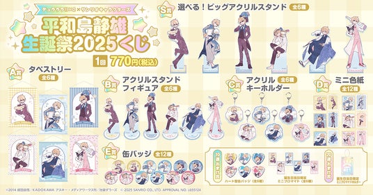 株式会社KADOKAWA(本社:東京都千代田区、取締役 代表執行役社長 CEO:夏野 剛、以下 KADOKAWA)は、運営するオンラインくじサービス「くじ引き堂」において、TVアニメ『デュラララ!!×2』オリジナル商品が手に入る<デュラララ!!×2 × サンリオキャラクターズ 平和島静雄生誕祭2025くじ>を、2025年1月23日(木)12時より販売します。