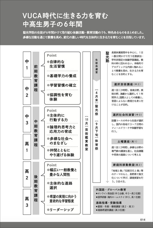 聖光学院の中高6年間のカリキュラム。学習指導要領のほかに、工藤校長の学校改革を経て、リベラルアーツや聖光塾など、非認知能力をより育むカリキュラムを多数実施。