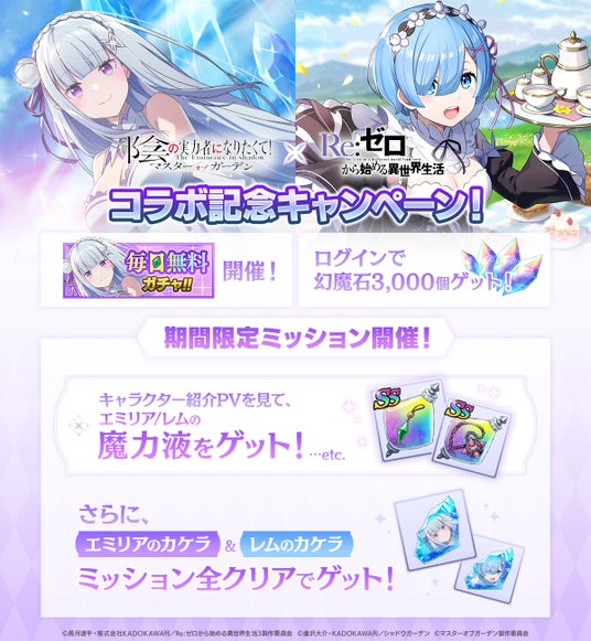 『陰の実力者になりたくて!マスターオブガーデン』×TVアニメ『Re:ゼロから始める異世界生活』コラボイベント開催決定!「エミリア」「レム」が「カゲマス」に登場!