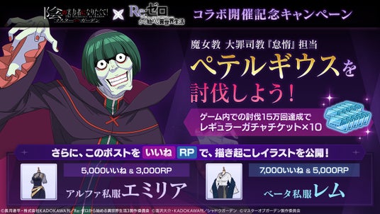 「ペテルギウス討伐キャンペーン」を実施! 「いいね」や「RP」数に応じてエミリアとレムの描き下ろしイラストが公開されるほか、ゲーム内の討伐回数15万回以上でレギュラーガチャチケット10枚を全員にプレゼント! みなさまのご参加をお待ちしています!