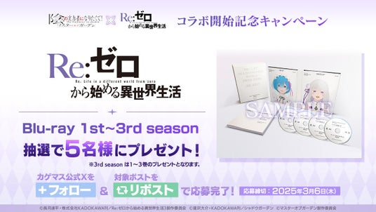 コラボを記念し、「カゲマス」公式Xでは『Re:ゼロから始める異世界生活』のBlu-ray 1st season、2nd season、3rd seasonの1~3巻セットが当たるキャンペーンを開催します! まだ『Re:ゼロから始める異世界生活』を見たことがない方も、既にファンの方も、この機会をお見逃しなく!