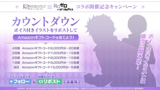 株式会社KADOKAWA(本社:東京都千代田区、取締役 代表執行役社長 CEO:夏野剛、以下 KADOKAWA)と株式会社Aiming(本社:東京都渋谷区、代表取締役社長:椎葉忠志)は、3DアニメーションRPG『陰の実力者になりたくて!マスターオブガーデン』(以下、「カゲマス」)において、TVアニメ『Re:ゼロから始める異世界生活』とのコラボイベントを開催することをお知らせいたします。