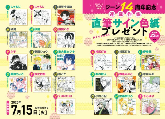 今月はジーン14周年を記念し、ジーン連載作家陣の豪華サイン入り色紙をプレゼント!!